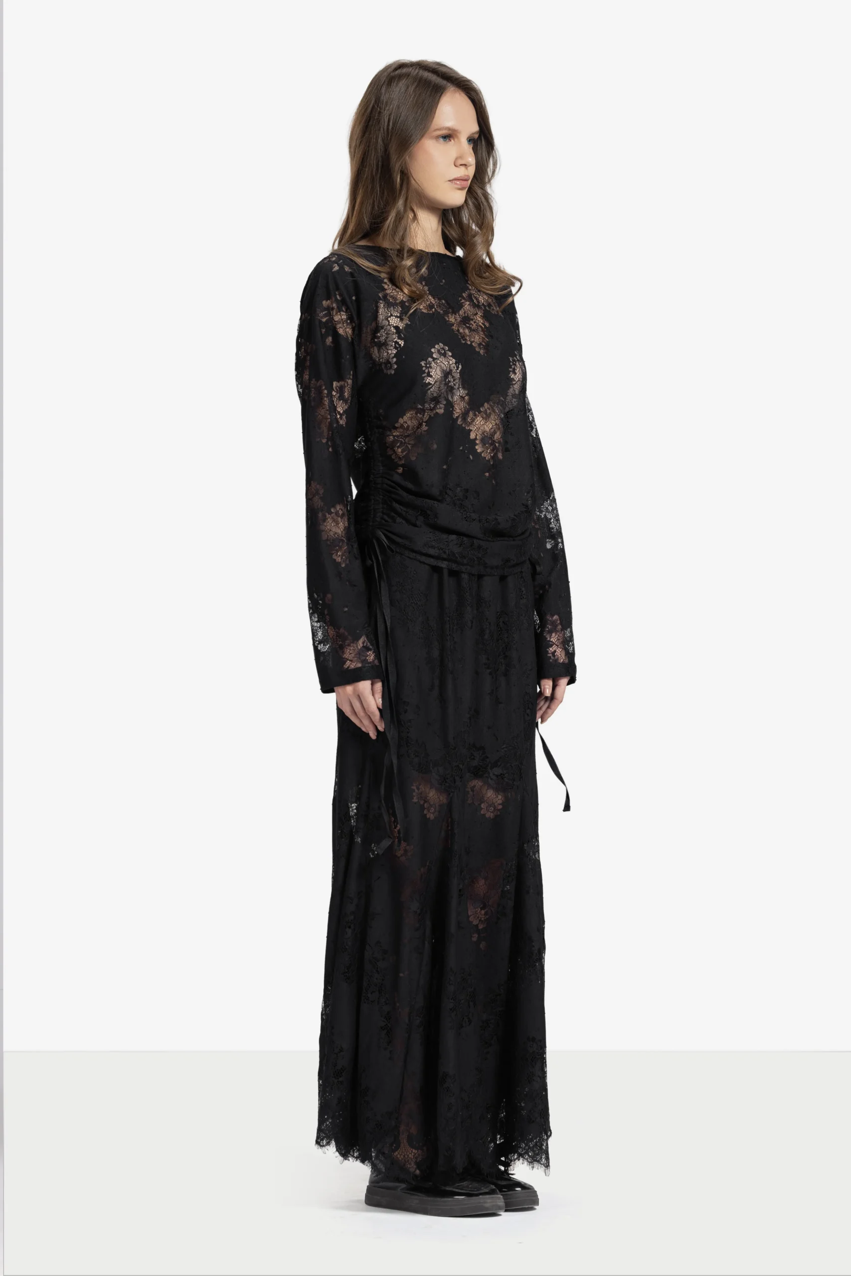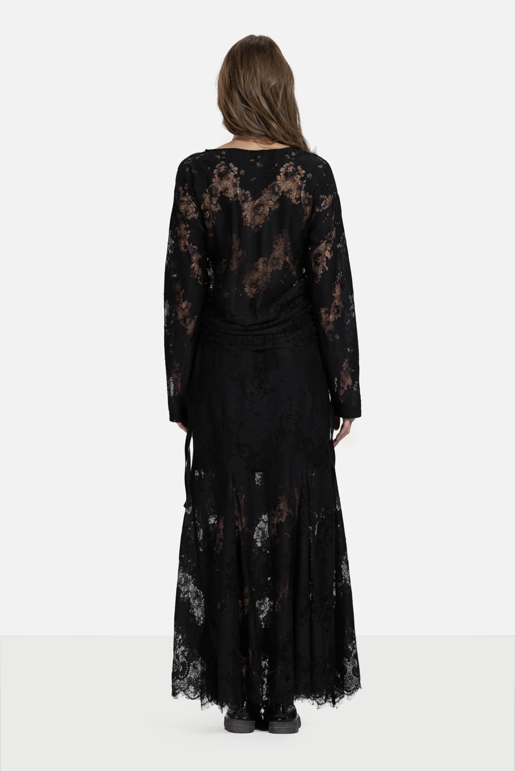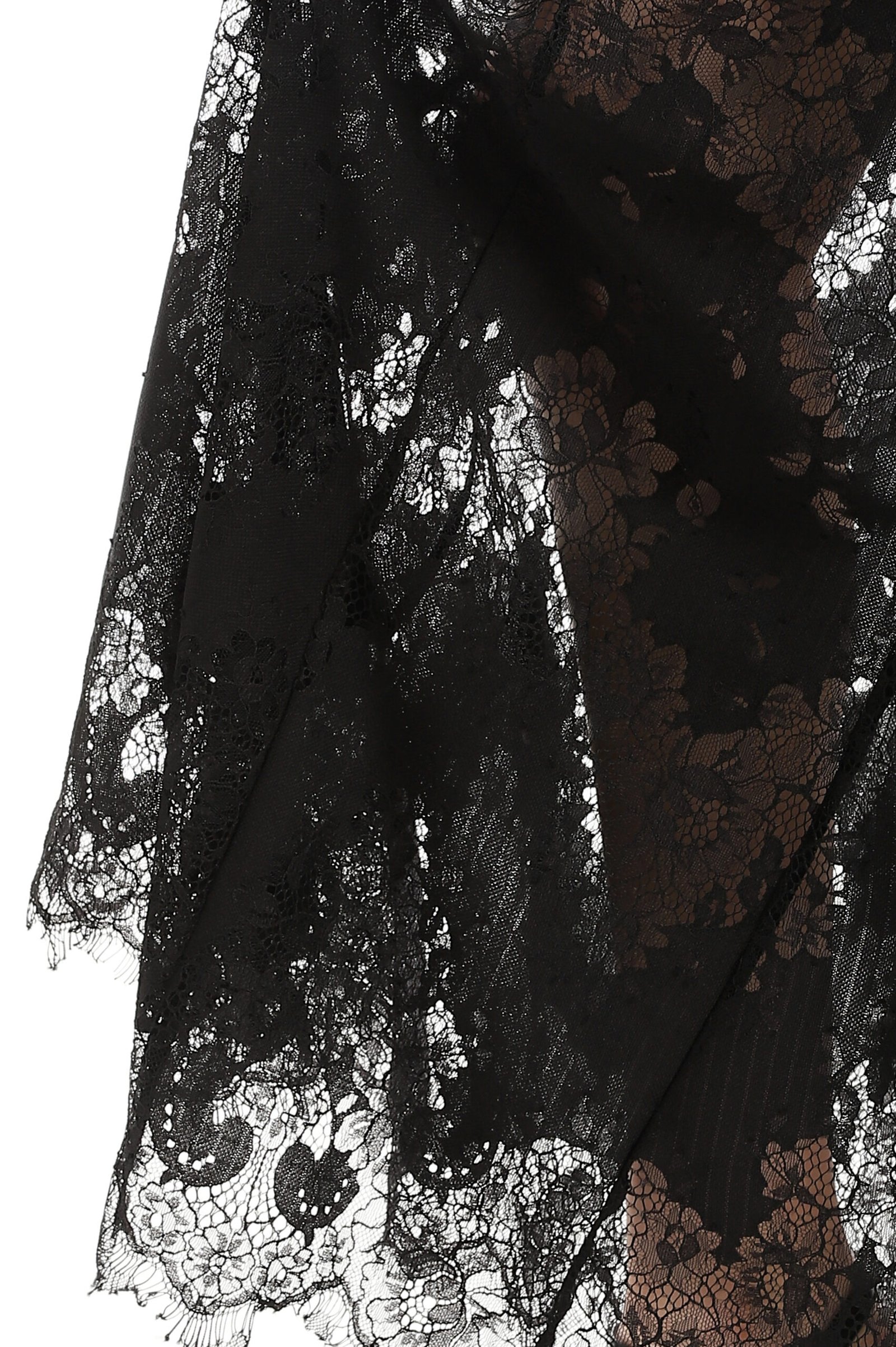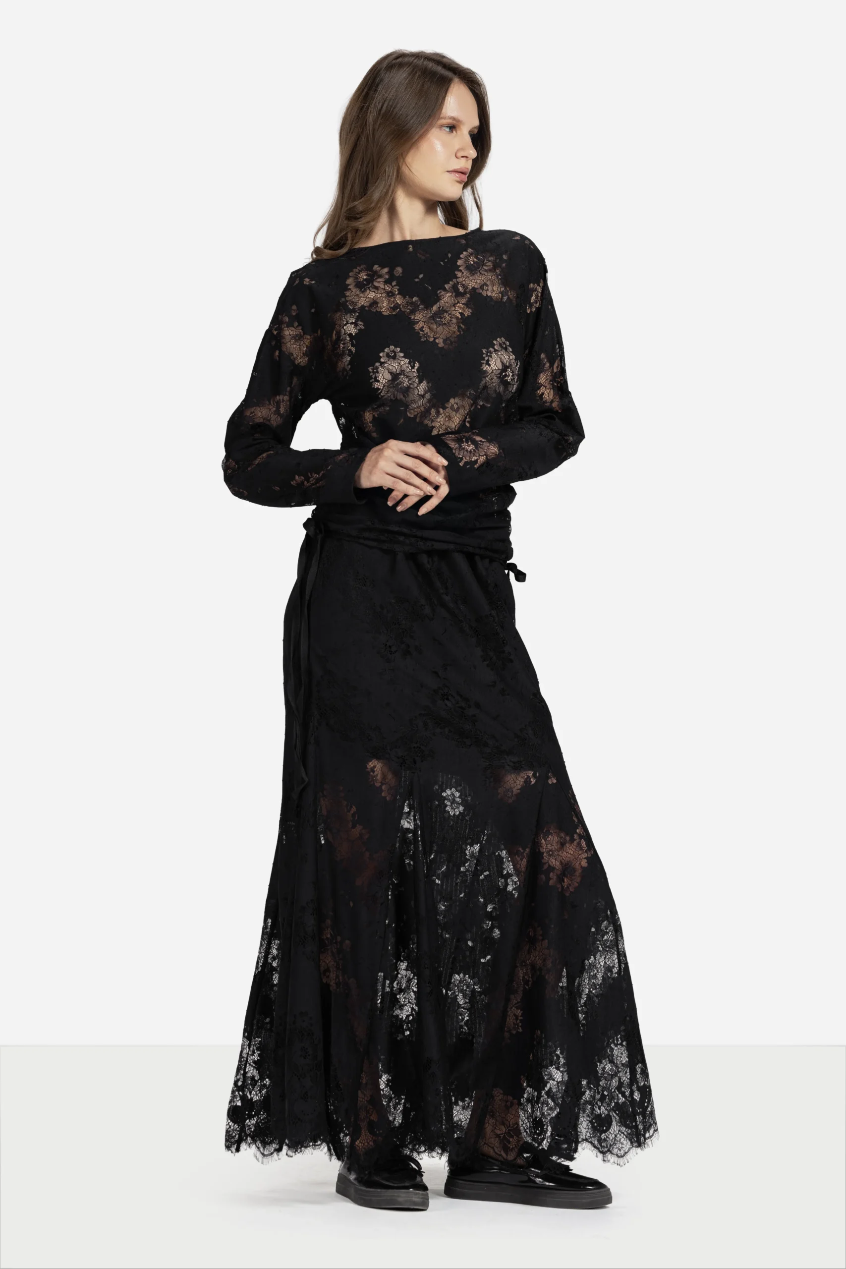 Flowy lace skirt with a wide hem, offering effortless elegance and femininity details.