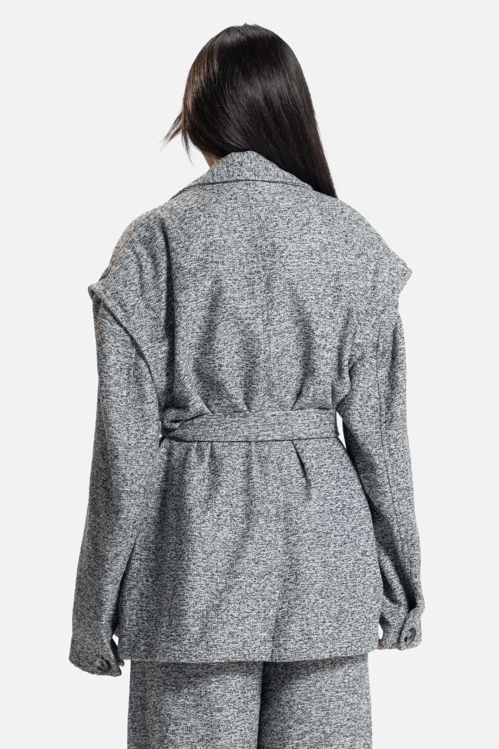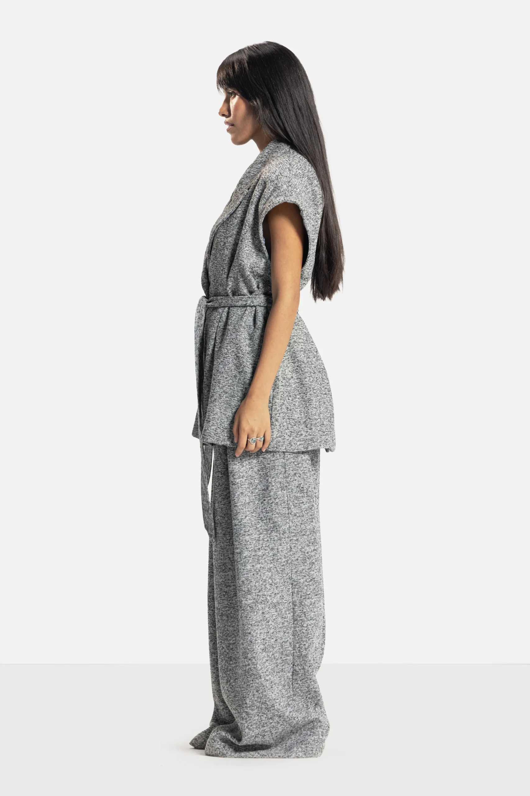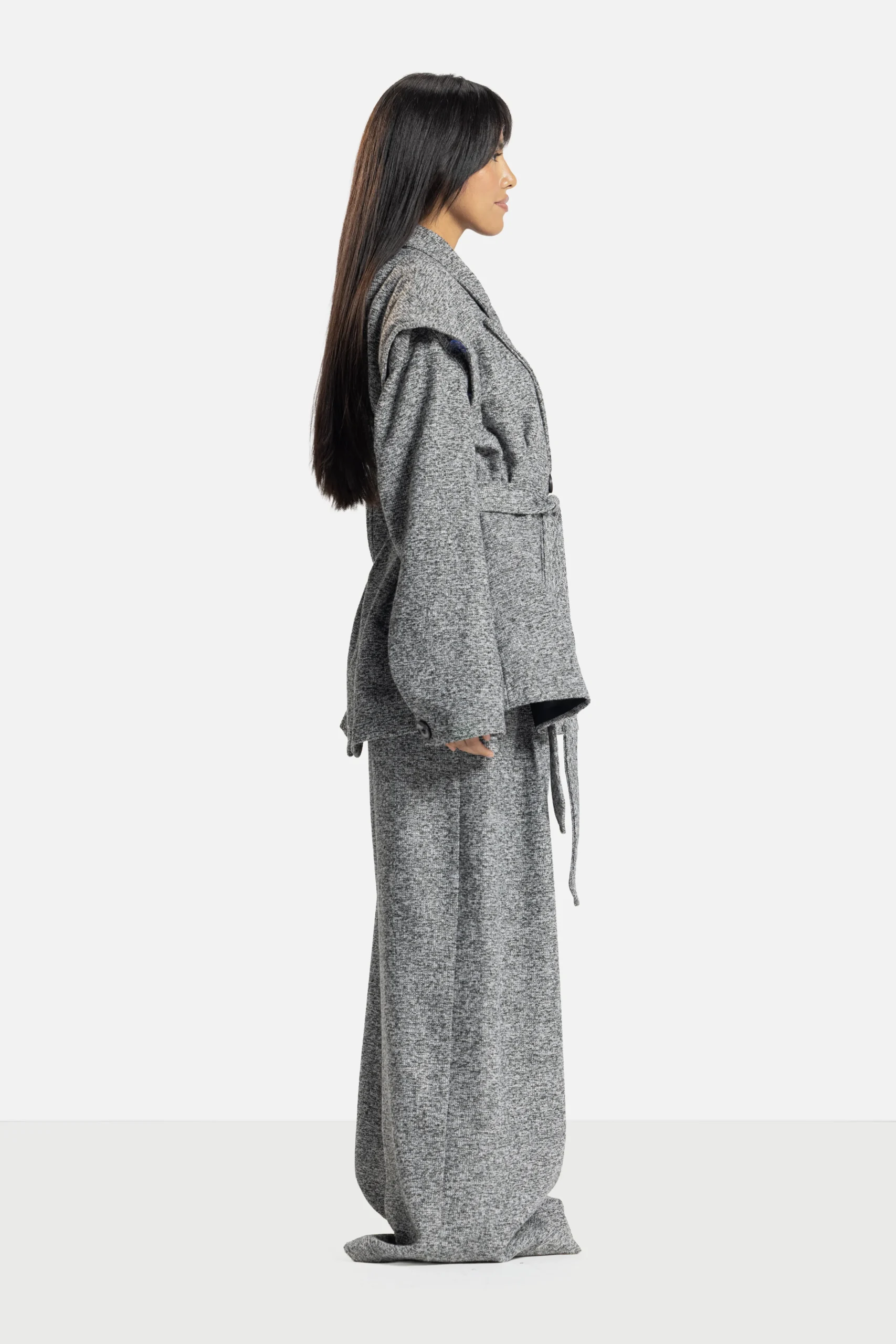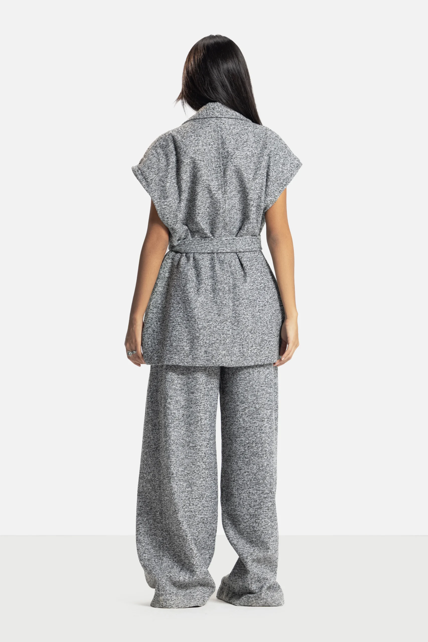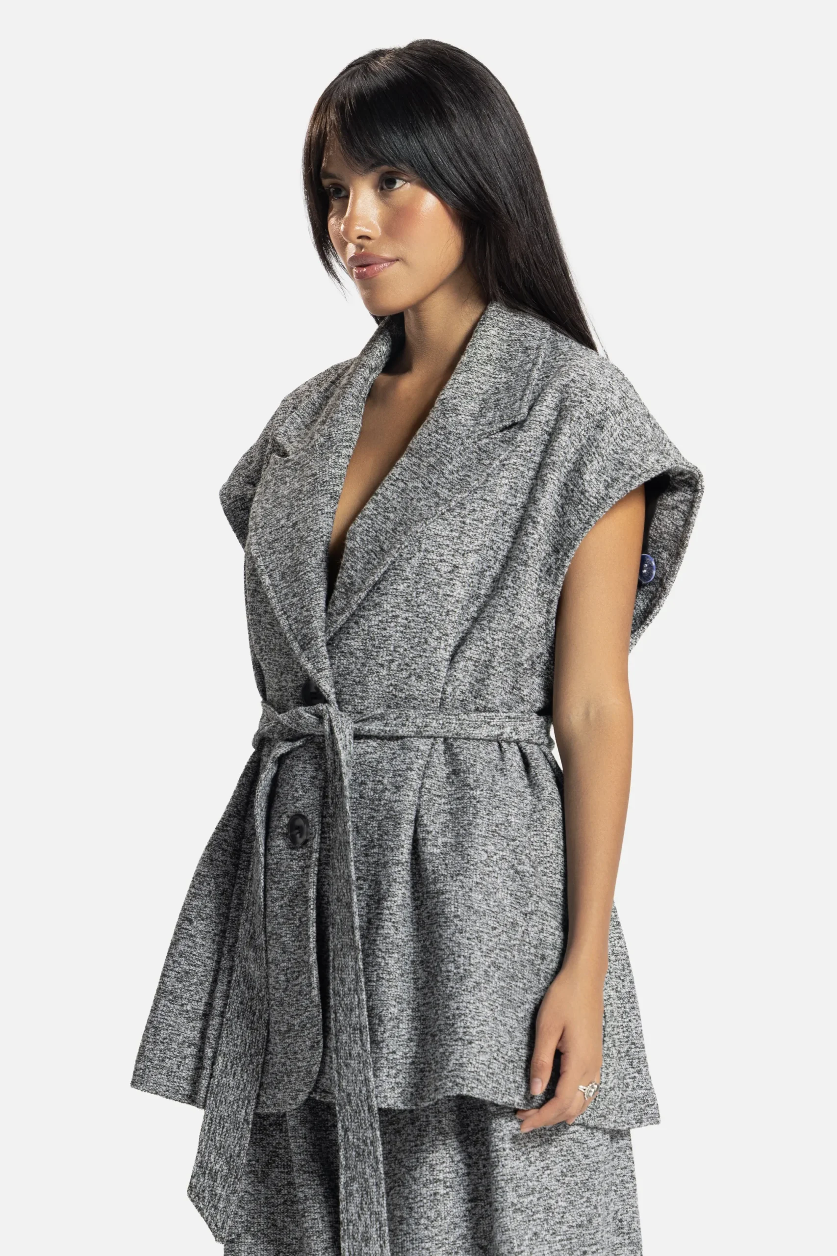 A study in adaptability. The Verse Forme Jacket/Vest offers multiple identities, wear it sleeveless for ease or with its detachable sleeves for tailored structure. Its belted waist and architectural lapel embody the brand’s dialogue between form and fluidity.