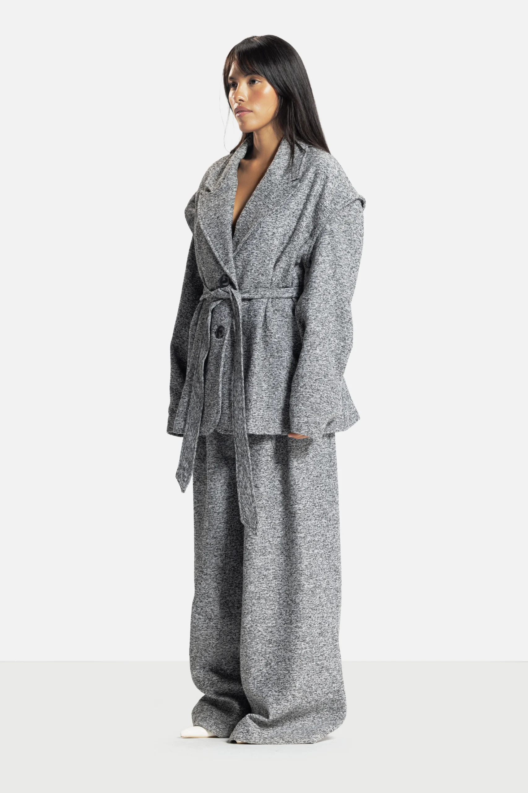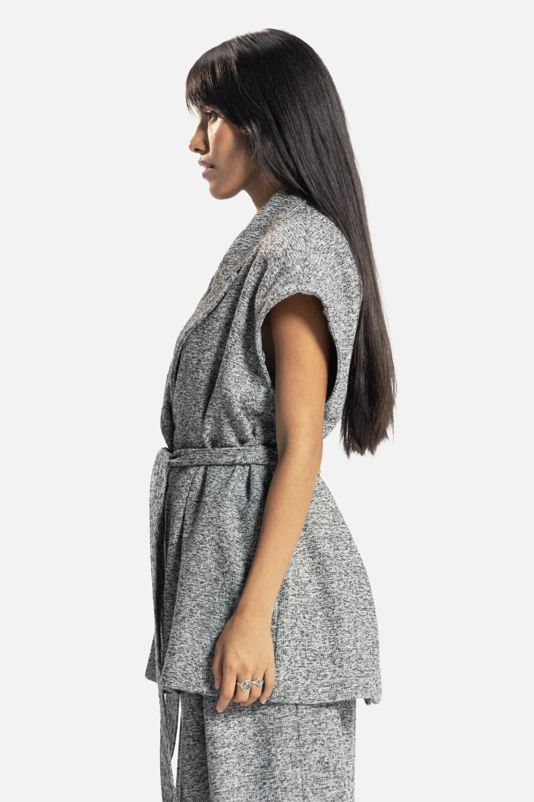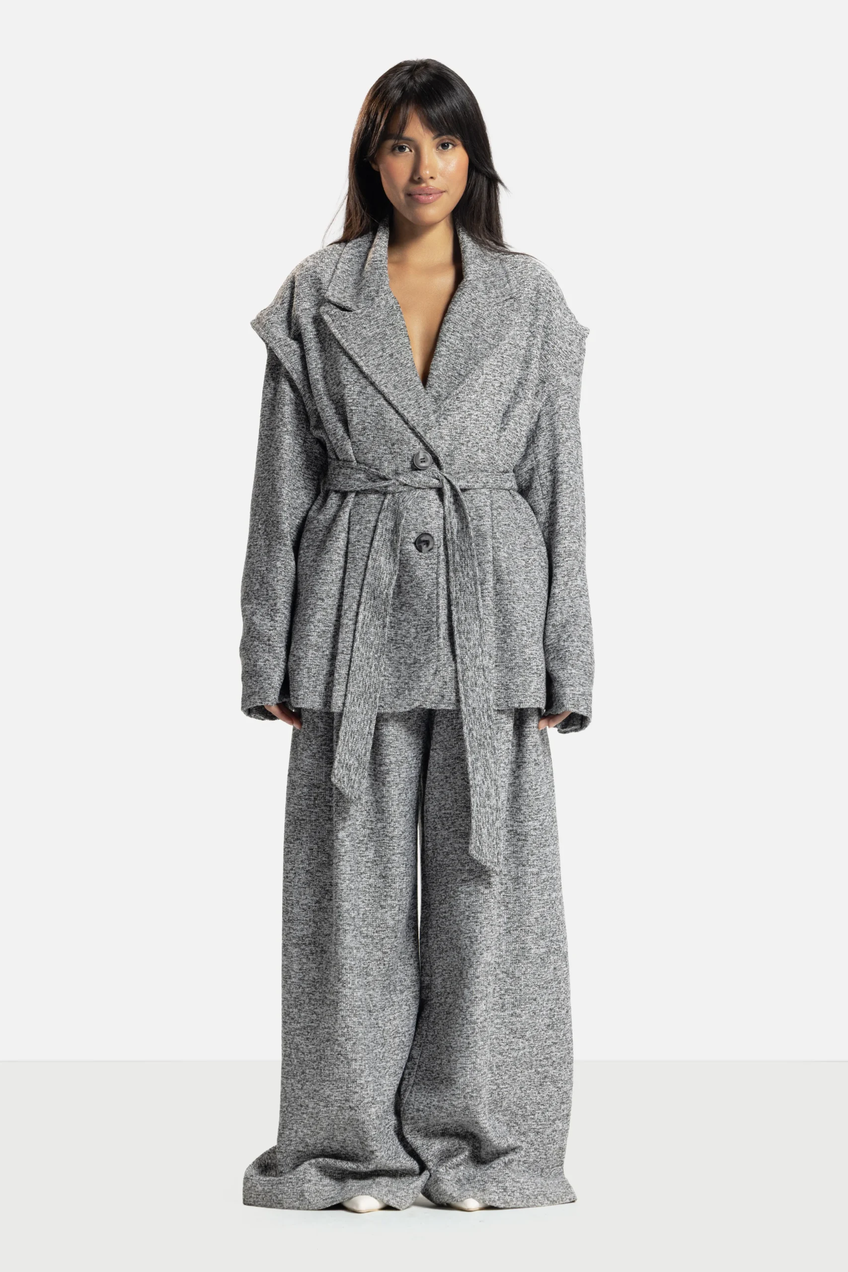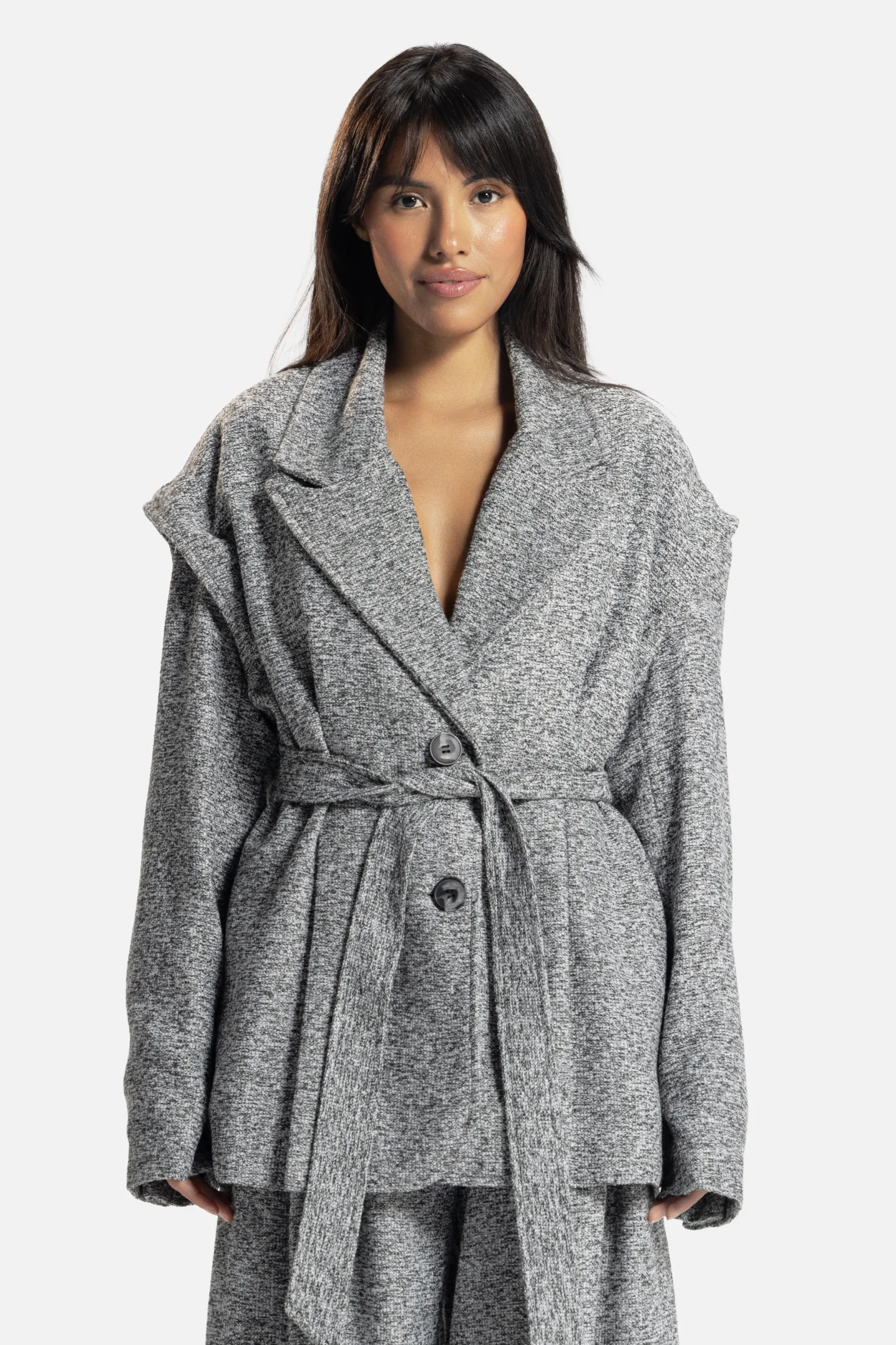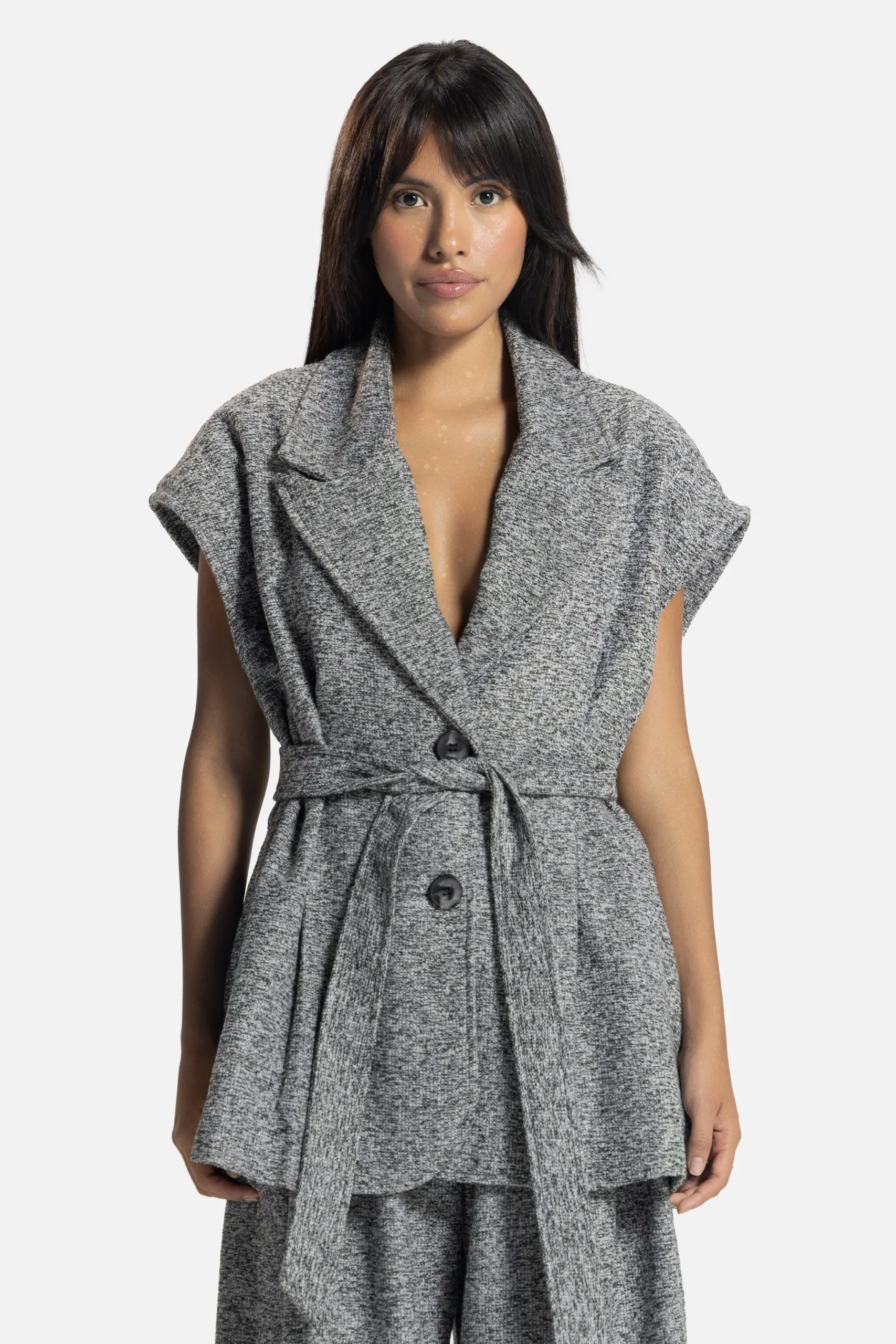 A study in adaptability. The Verse Forme Jacket/Vest offers multiple identities, wear it sleeveless for ease or with its detachable sleeves for tailored structure. Its belted waist and architectural lapel embody the brand’s dialogue between form and fluidity.