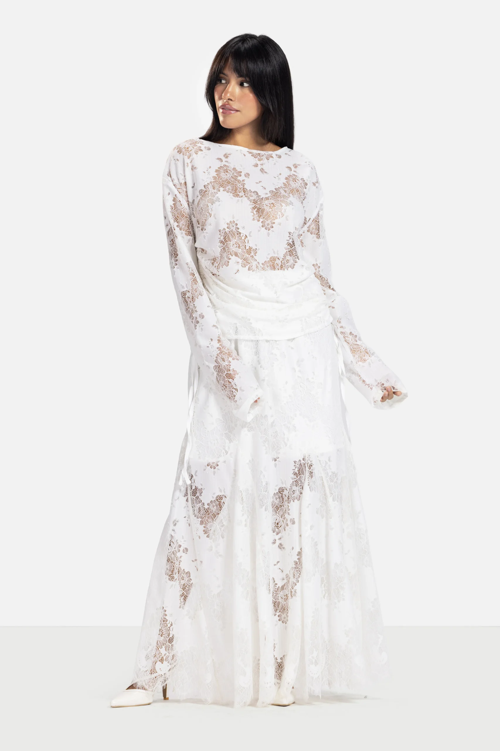 - Elongated lace sleeves designed to reach the fingers (With a thumb hole detail)